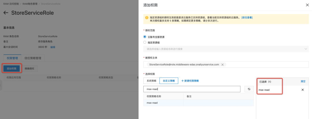 acs:mse:*:*:instance/${instanceId} 表示授权到实例级别,acs:mse:*:*:instance/${instanceId}/${namespaceId} 表示授权到命名空间级别。