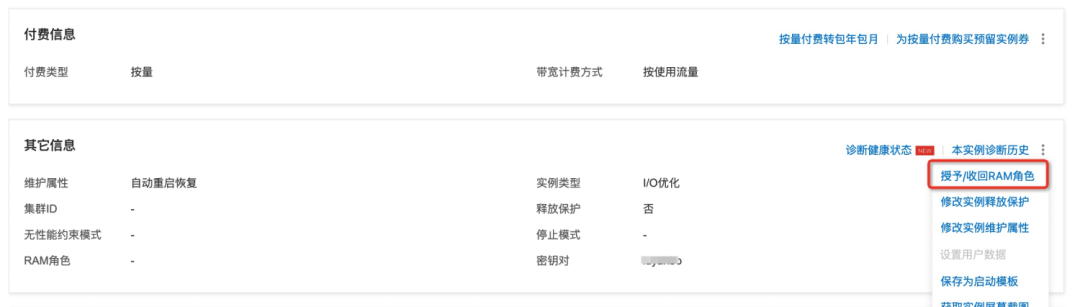 在对应的?ECS 详情页面,点击?授予/收回 RAM 角色: