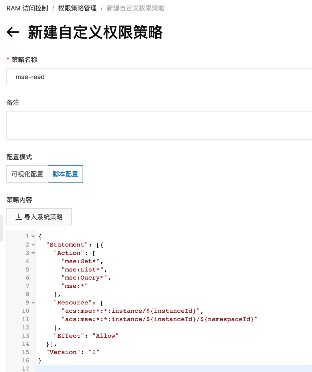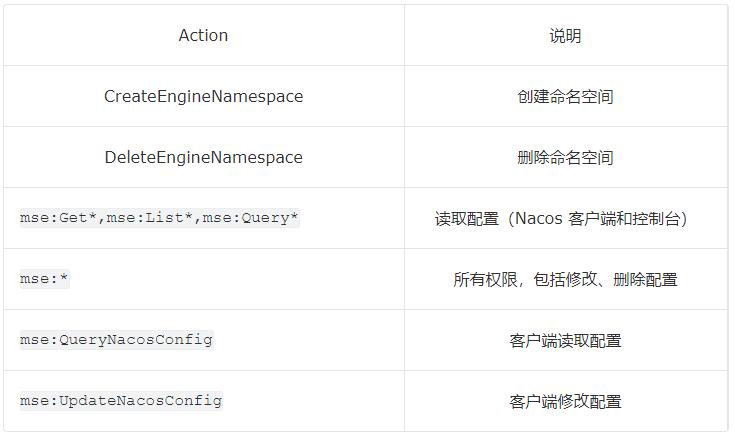 图中,mse:Get*、mse:List*、mse:Query* 表示能读取配置,mse:* 表示所有权限,包括修改权限。