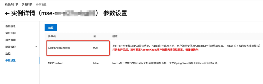 首先,在 MSE 上申请一个 Nacos 实例(并记下实例 id),然后在?实例详情->参数设置?界面,将 ConfigAuthEnabled(配置鉴权)参数设置为 true,这样匿名用户就无法获取配置: