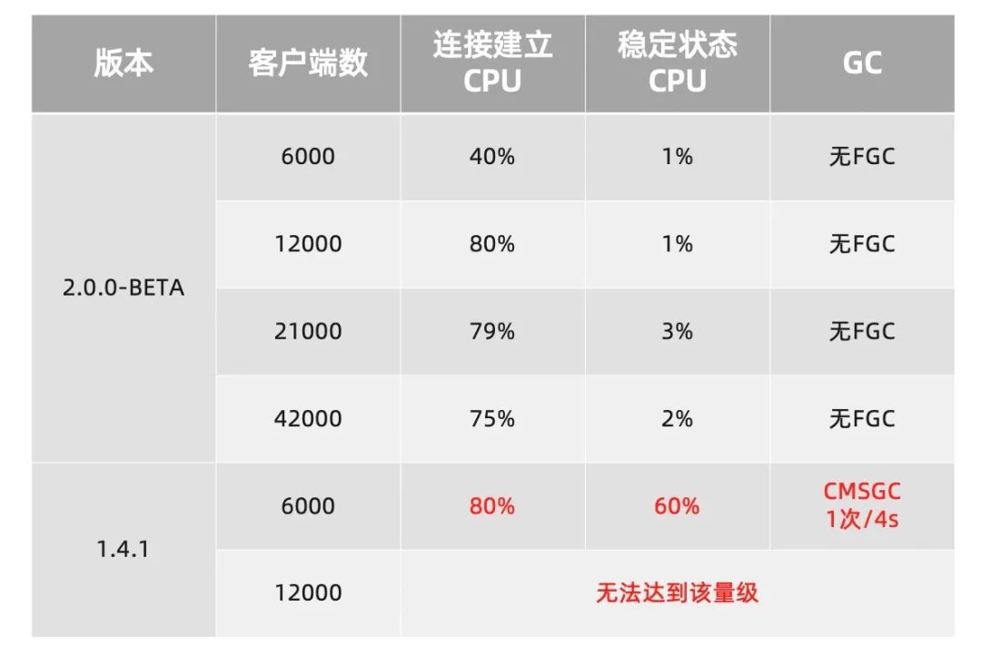 GC 状态,推送完全失败,集群不可用;在 2W 客户端规模下,虽然服务端运行状态正常,但由于心跳处理不及时,大量服务在摘除和注册阶段反复进行,因此达不到稳定状态,CPU