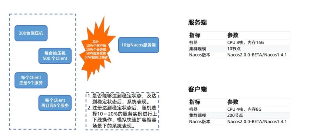 服务发现场景我们主要关注客户端数,服务数实例数,及服务订阅者数在大规模场景下,服务端在同步,推送及稳定状态时的性能表现。同时还关注在有大量服务在进行上下线时,系统的性能表现。