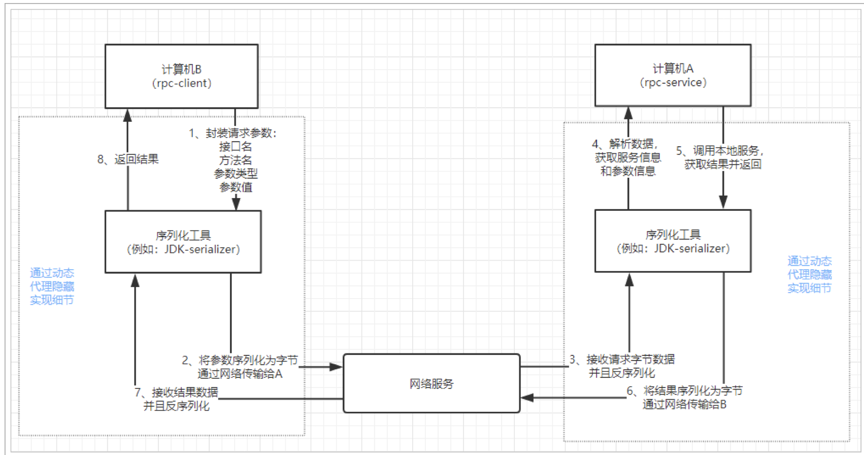 要实现远程调用,肯定是通过网络传输数据。A程序提供服务,B程序通过网络将请求参数传递给A,A本地执行后得到结果,再将结果返回给B程序。这里需要关注的有两点: