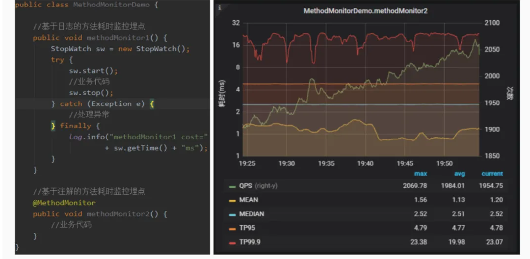 很多情况下,需要对某些业务方法耗时进行监控,传统的埋点方式是在方法入口和出口添加监控代码,业务代码侵入高,开发成本高。