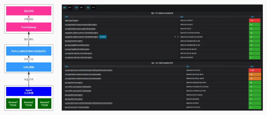 一种应用场景是,实时收集各个服务日志流中的异常信息。我们监听日志采集的Kafka消息,Flink实时解析出服务异常名称,将各个服务产生的异常实时推送到监控系统,并在Grafana上集中展示。基于Pushgateway的异常监控方案及效果图如下。