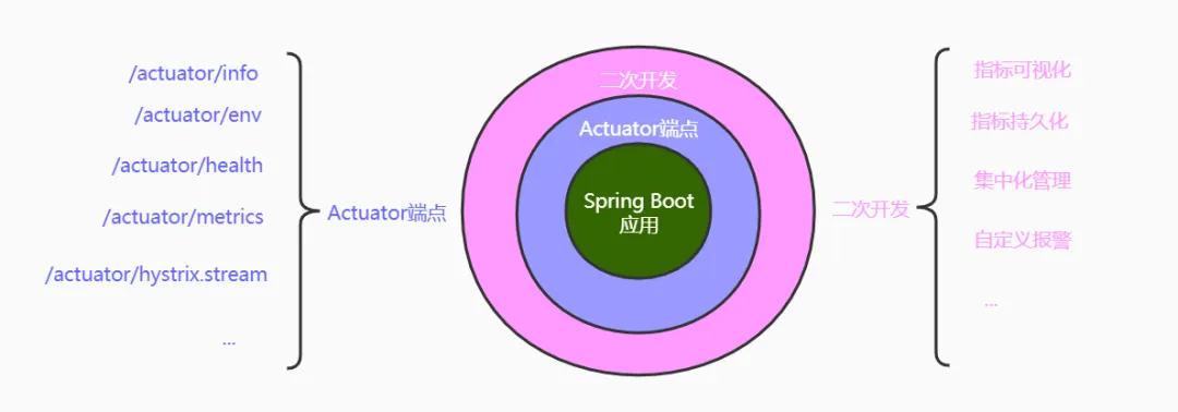 Actuator端点是Spring Boot应用开发者的最大福利之一,可以零成本了解单实例运行情况。缺点是,同服务多实例指标聚合,指标持久化,指标时序可视化,都需要二次开发。下图描述Actuator端点监控的方案。