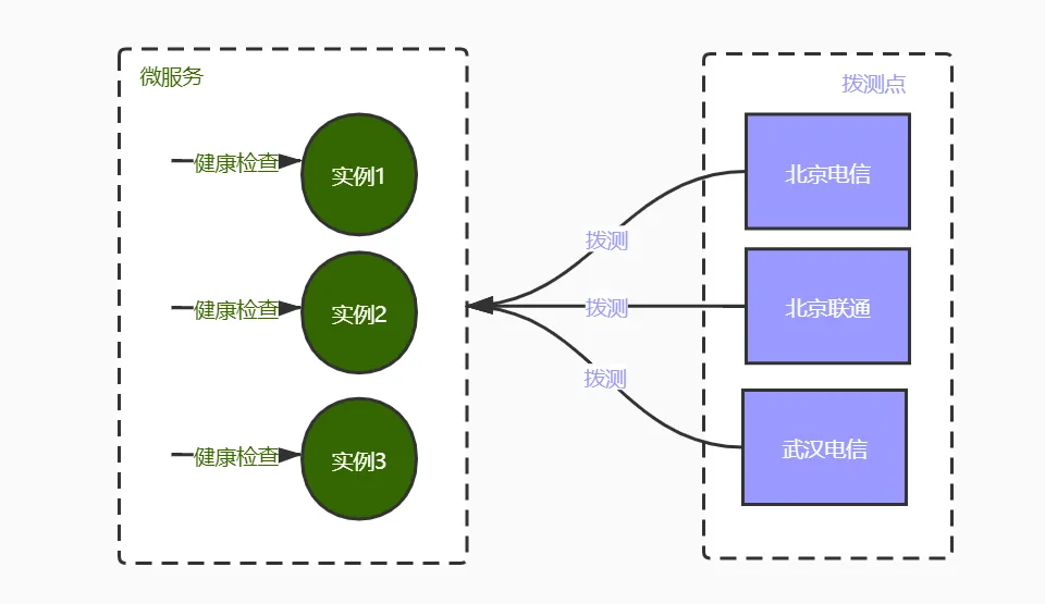 下图描述拨测监控的方案,主要包括微服务实例自发的健康检查和各拨测点定时拨测。