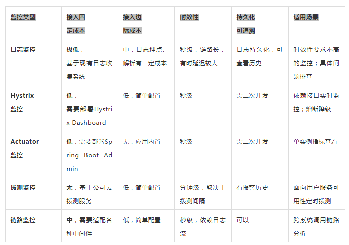 其中,接入固定成本表示为引入相应监控而产生的一次性固定投入,包括学习调研,二次开发,集成适配等成本。接入边际成本表示每新增一个微服务或一个监控指标,新产生的开发配置成本。几种监控方案对比和适用场景如下表所示。