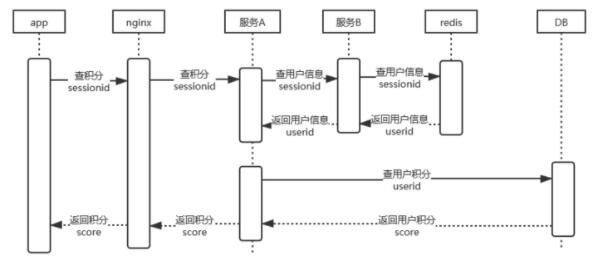 当用户在app点击查询积分时,nginx看见url里有查询积分关键字,会根据nginx.conf的配置将请求发送到A服务,app会有个sessionid发送给A服务,A服务远程调用B服务的检查登陆状态的接口,将sessionid传给接口,B服务接口被调用,使用sessionid到redis查用户信息,如果查询到redis有对应的用户信息,将用户信息返回,A服务接收到远程调用接口返回的用户信息userid,接下来根据用户信息到数据库DB查询积分情况。