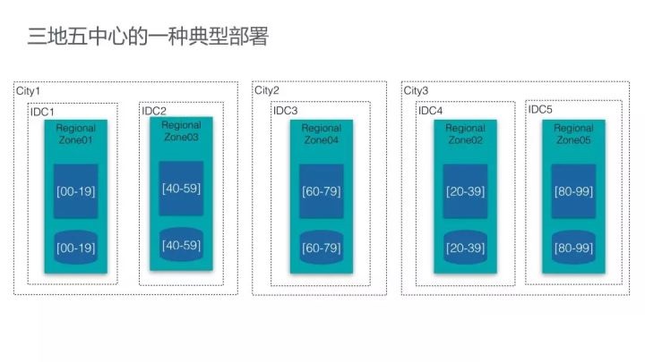 我们把单元叫做Regional Zone。例如,数据按100份分片,逻辑上分为5个Regional Zone,每个承载20份数据分片的业务。初期可能是部署成两地三中心(允许多个单元位于同一个数据中心)。随着架构的发展,再整单元搬迁,演化成三地五中心,应用层无需感知物理层面的变化。