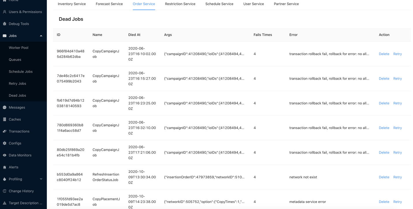 特别的,我们可能更关注于哪些任务执行失败了,以及失败原因,因此我们把失败任务的诸如参数、错误内容等详细信息展示出来,并提供了重试功能,以便在工程师在排查完错误原因后,可以手动触发重新执行任务。如下图展示了 Order Service 最近执行失败的任务、任务参数、失败原因等等。