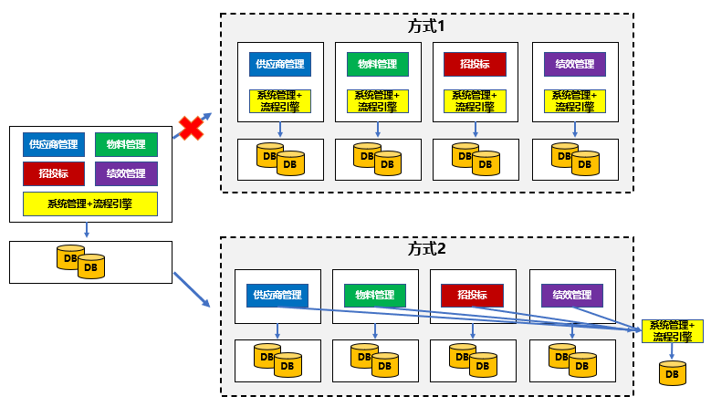 而基于上面场景,供应商和物料本身关联业务场景相当多,放在一个数据库显然是更加适合。经过重新思考后,我们整体的逻辑架构变化为: