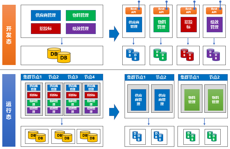 我们要构建的SRM系统就是典型的单体应用,那么我们来看这个单体应用构建模式转变到微服务构建模式后究竟带来了哪些变化。如下图,我们从开发态和运行态去分析。