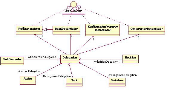 实现这个接口的一共有六个类,分别是FieldInstantiator,BeanInstantiator,ConstructorInstantiator,ConfigurationPropertyInstantiator,DefaultInstantiator和XmlInstantiator。以上六个类都是在org.jbpm.instantiation包中,其中后两个类虽然定义了,但是在jbpm3.1.3中没有被使用。