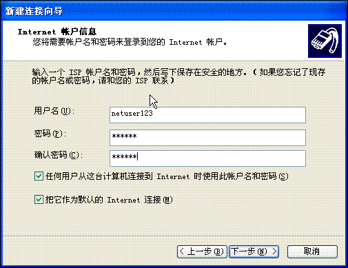 7、在下图的界面中各框里相应的输入运营商提供给你的帐号、密码,底下几个(两个或三个)可选项默认是选中,可根据需要选择,然后再点“下一步”。