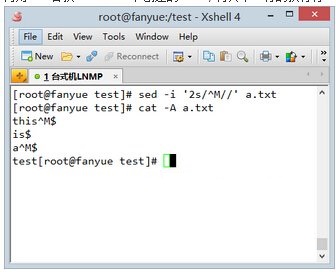 这里我把文件的第二行的换行符替换成了linux格式的$,注意sed命令中的^M