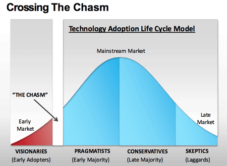 所有产品都会经历从小众到主流的过程。有本书叫《Crossing the Chasm》,其中有一个模型叫做Technology adoption life cycle model,“鸿沟”的两侧分别是小众市场和主流市场。中美两个市场的“鸿沟”(Thechasm)是不同的。对于中国来说,“鸿沟”贴近主流市场的一侧跨度会更高,很多产品在还未跨越鸿沟之前就已经止步。当小众和主流人群之间的差异(文化、心态、生活方式等)越来越小的时候,“鸿沟”给创新产品带来的阻力就越小。这也可以解释为什么国内产品同质化严重。因为在此之前已经出现过被市场验证的产品,所以一些创业者会更愿意选择这种低风险的做法。但是,中国市场也有优势,主流市场的量级非常大,如果能迈过鸿沟,就能成为领头羊。