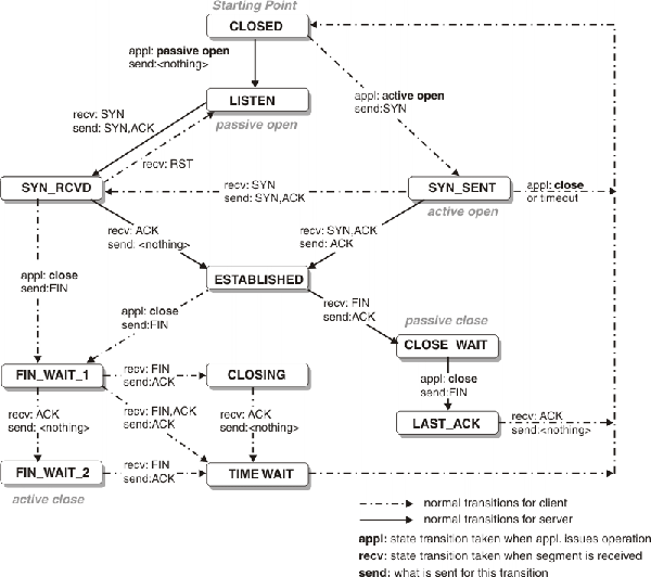这个状图转移图非常非常关键,也比较复杂,我自己为了方便记忆,对这个图进行了拆解,仔细分析这个图,可以得出这样一个结论,连接的打开与关闭都有被动(passive)与主动(active)两种,主动关闭时,涉及到的状态转移最多,包括FIN_WAIT_1、FIN_WAIT_2、CLOSING、TIME_WAIT。