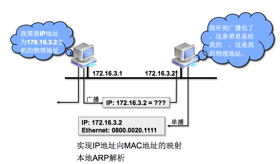 连接到同一LAN的所有主机都接收并处理ARP广播,目的主机的ARP层收到这份广播报文后,根据目的IP地址判断出这是发送端在寻问它的MAC地址。于是发送一个单播ARP应答。这个ARP应答包含IP地址及对应的硬件地址。收到ARP应答后,发送端就知道接收端的MAC地址了。
