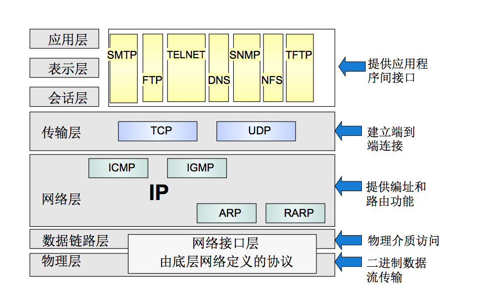 TCP/IP协议不是单纯的两个协议,是一组不同层次上的多个协议的组合,常称为TCP/IP协议簇或者互联网协议簇。TCP/IP也是互联网的事实上的标准,为实现整个网络的互联提供指导。TCP/IP层次组合很难用OSI的七层模型来套用,它是OSI模型的浓缩,将原来的七层模型合并为四层协议的体系结构,自顶向下分别是应用层、传输层、网络层和网络接口层,没有OSI参考模型的会话层和表示层,一般认为TCP/IP的会话和表示功能是在传输层或应用层上完成的。
