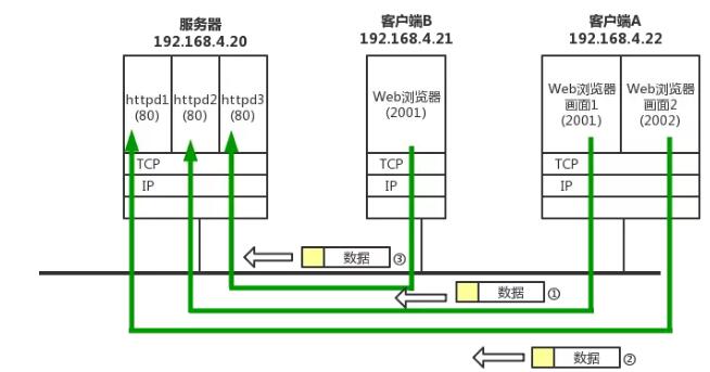 ① 和② 的通信是在两台计算机上进行的。它们的目标端口号相同,都是80。这里可以根据源端口号加以区分。