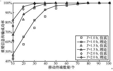 contact),在UE间建立机会通信(opportunistic communication),便于重要信息在UE间的传递;热点高容量场景中,UE密集分布在固定区域内并请求相同信息的下载,重复信息的传输使得基站负载过大,此时通过对UE间共享信息的研究,基站首先将共享信息广播给部分UE,该部分UE作为初始共享信息接收者,与其他UE建立机会通信完成信息传递,减轻基站流量负载。借助机会通信,广域覆盖场景中的重要信息传输成功率随着网络中终端数目的增加而增加,如图3所示,这是由于终端数目的增加,该区域内终端密度提升,UE彼此相遇概率更高,用于重要信息传递的机会通信建立概率更高。相同终端密度下,重要信息的生命周期T越长,成功传输率更高。热点高容量场景下,进行机会通信的用户数目越多,流量卸载越多,基站负载越小,如图4所示,不同初始共享信息接收者选取策略下,机会通信最大用户数目不同,对基站的流量卸载帮助不同。