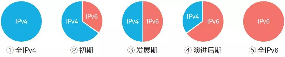 在向IPv6过渡过程中,主要从两个层面展开,一是对基础网络的逐步改造;二是对应用业务进行IPv4向IPv6的迁移。总体来看,主要分如下五个阶段展开: