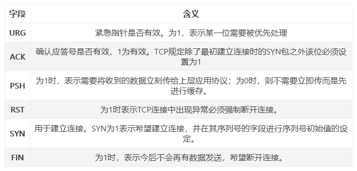 PSH、RST、SYN、FIN。这些控制标志也叫做控制位。