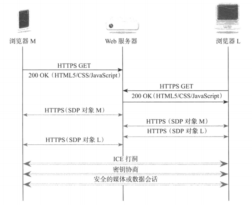 此场景中,浏览器M和L直接交换媒体,只是它们运行的Web服务器不用而已。每个浏览器的会话描述对象都会映射至Jingle[XEP-0166]session-initiate消息和session-accept方法。