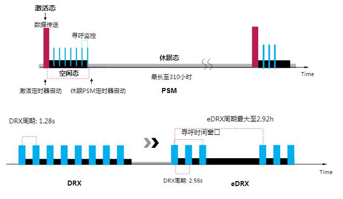 DRX模式:该模式的终端基本处于在线状态,物联网平台的下行数据随时可达终端设备,在每个DRX周期(例如1.28秒、2.56秒,5.12秒 或者10.24秒),终端都会检测一次是否有下行业务到达,适用于对时延有高要求的业务。