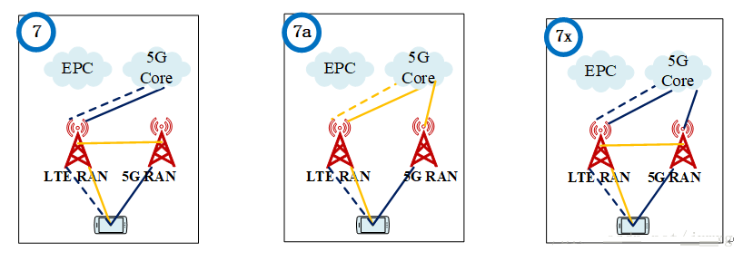同时部署了5G RAN和NGC,但Option7以LTE eNB为主基站。所有的控制面信令都经由eNB转发,
