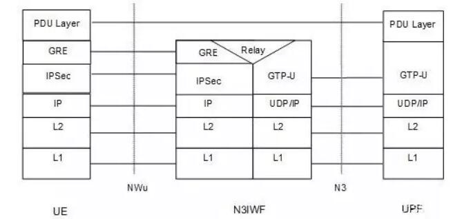 N3口使用GTP-U协议,这和3G/4G一样,GTP-U定义于TS29.281;5G-AN用户面协议栈取决于具体的接入网类型。