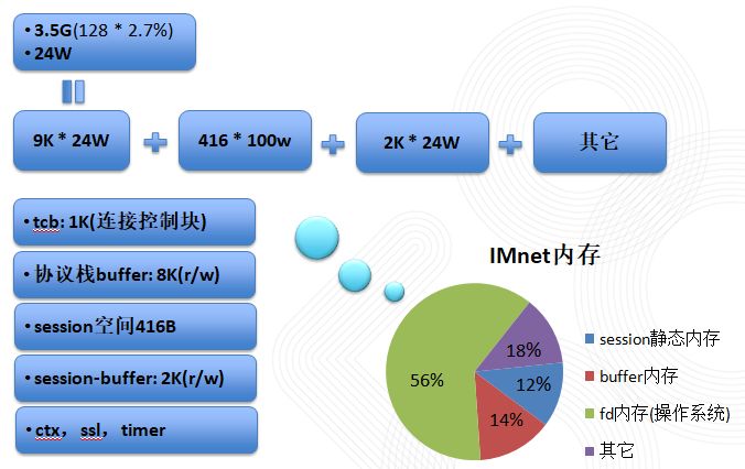 其中最主要的内存使用是 tcp 协议栈,包括 tcb 和读写缓存,其它内存使用体现在 session
