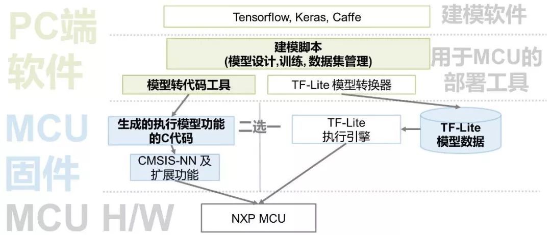 如图首先在PC上用 TensorFlow 等框架去许梿符合要求的模型,然后把模型转为代码,与CMSIS-NN结合(CMSIS-NN是arm的一个开源sdk)。另外一种就是利用模型转换器转换为嵌入式设备模型,然后通过相应引擎去部署到嵌入式设备上。下面我们详细讲下这两种方法。