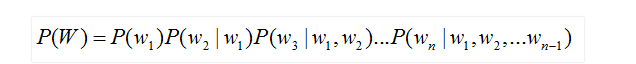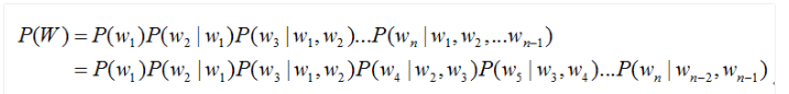 由于条件太长,使得概率的估计变得困难,常见的做法是认为每个词的概率分布只依赖于前几个出现的词语,这样的语言模型成为n-gram模型。在n-gram模型中,每个词的概率分布只依赖于前面n-1个词。例如在trigram(n取值为3)模型,可将上式化简:
