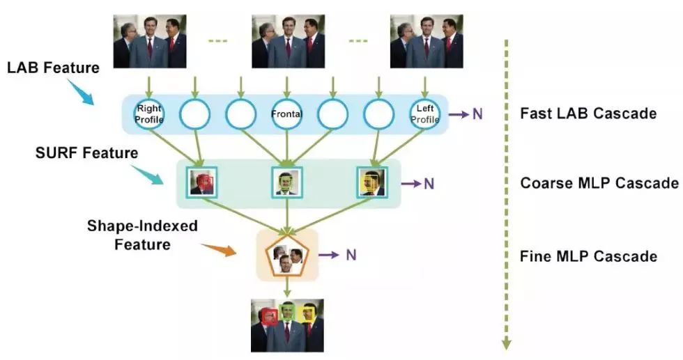 1. 人脸识别 人脸检测算法繁多,我们采用由粗到精的高效方式,即先用计算量小的特征快速过滤大量非人脸窗口图像,然后用复杂特征筛选人脸。这种方式能快速且高精度的检测出正脸(人脸旋转不超过45度)。该步骤旨在选取最佳候选框,减小非人脸区域的处理,从而减小后续人脸校准及比对的计算量。