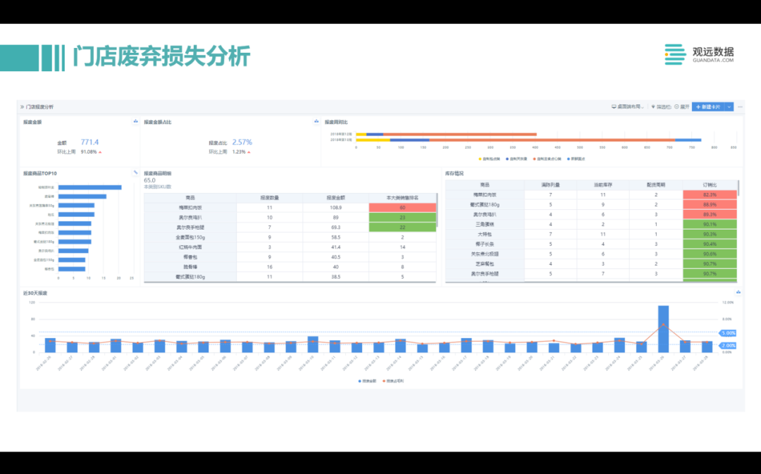 通过监控大屏和手机端的消息提醒,及时告知卖场管理人员当前时间点卖场业绩的完成进度、重点品类的销售占比、重点单品的进销比等指标是否合理?是否存在滞销的风险?及时做好店间调拨和打折出清。