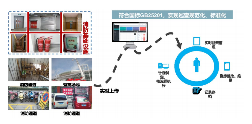 在消防通道安装智能识别监控系统,实现通道内物品堵塞智能识别,一旦出现堵塞情况,自动产生报警信号上传到中心平台,确保消防通道、安全出口、防火门正常工作。
