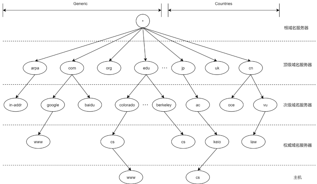 为了根据域名得到 IP 地址,需要建立一个域名和 IP 地址之间的映射关系,简单点就是用一个文件来完成,这种叫 静态映射 ,复杂点就是用专门的服务器来完成,这种叫 动态映射 ,提供动态映射服务的服务器就叫 DNS 服务器 。 windows 用户比较熟悉的静态映射方法就是通过 hosts 文件,位置在 C:\Windows\System32\drivers\etc\hosts,只要在 hosts 文件中写上你想访问的域名和地址,系统内置的 DNS 解析器会优先解析,不会访问 DNS 服务器。Linux 下是 /etc/hosts。 由于存在单点故障,DNS 服务器不可能设计成集中式的,由于需要解析的域名信息众多且复杂,DNS 服务器必须足够多,为了方便管理,DNS 服务器最后呈现的是 具有层次结构的大型分布式集群系统 。如下图所示: