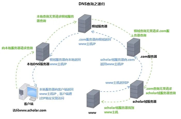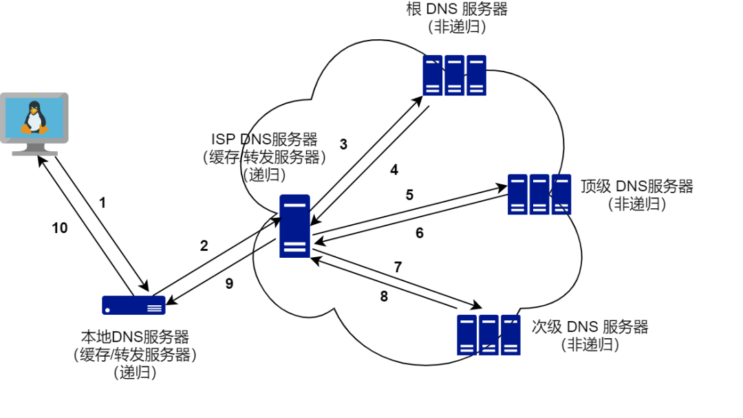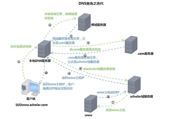 迭代查询就是每一层查询完之后都会返回,返回的结果是下一层 DNS 服务器的地址,根据返回的结果,接着去查询下一层,直到查询到最终的结果为止,如下图所示: