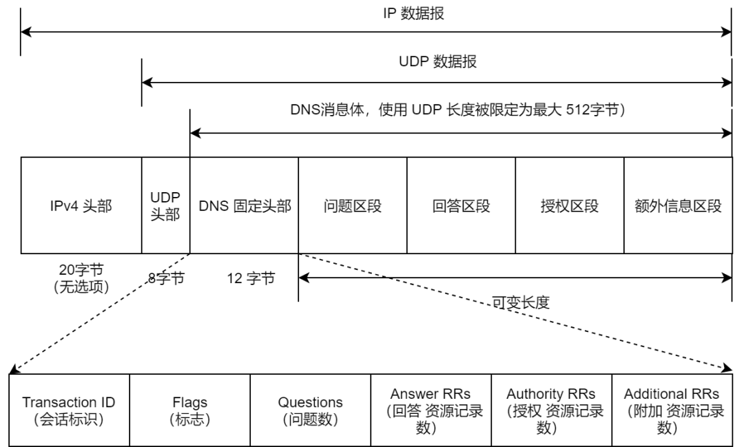 DNS 是用户层协议,传输层主要使用 UDP 协议,只有大包才可能使用 TCP 协议,具体原因请看这篇文章:为什么 DNS 使用 UDP 协议 首先看看 DNS 使用 UDP 协议整个报文的格式如下: