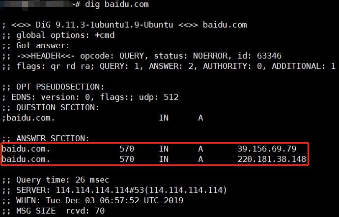 可以看到除了返回 IP 地址,还返回域名相关的各种记录。 2、将 IP 地址解析为域名 DNS 逆向查询,等同于 dig -x。