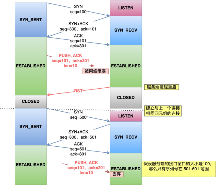 在新连接建立完成后,上一个连接中被网络阻塞的数据包正好抵达了服务端,刚好该数据包的序列号正好是在服务端的接收窗口内,所以该数据包会被服务端正常接收,就会造成数据错乱。