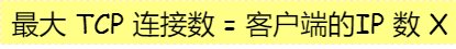 对 IPv4,客户端的 IP 数最多为 2的32次方,客户端的端口数最多为 2的16次方,也就是服务端单机最大