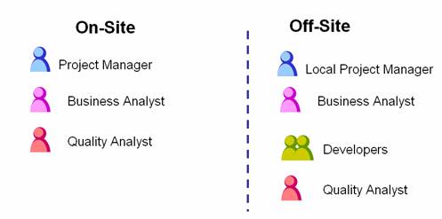 有的公司将需求分析人员放在on-site一端,开发者、测试人员和项目经理在off-site一方,同时在本地也保持常规的需求分析师。也有公司将测试人员和开发人员分放在不同地方,一方面开发,另一方面利用时差,在夜间测试并在第二天及时反馈测试结果。