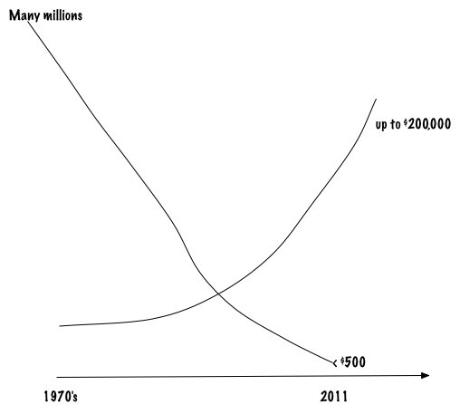回到早期的计算,机器比程序员要昂贵几个数量级。在20世纪70年代,在我开始以程序员身份打工那会儿,那时的公司可能会给经验极其丰富的程序员支付5万美元的年薪。而对于那些刚刚从学校走出来的新手,公司支付的年薪可能不到1.5万美元。我们当时觉得已经赚得非常多了!相比之下,公司可能每年花很多万美元的钱去租赁机器,或者花数百万美元买下机器。你可以看到,薪资水平与机器成本之间相去甚远!