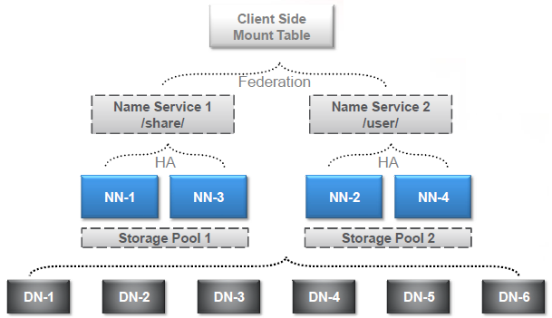 如果需要在客户端方便的访问若干个NN上的资源,可以使用客户端挂载表,把不同的目录映射到不同的NN,但NN上必须存在相应的目录