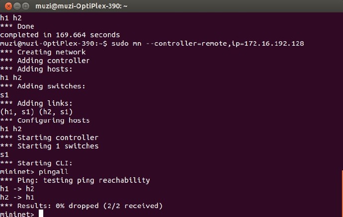 在另一个能ping通运行容器主机的机器上运行mininet,如下图: