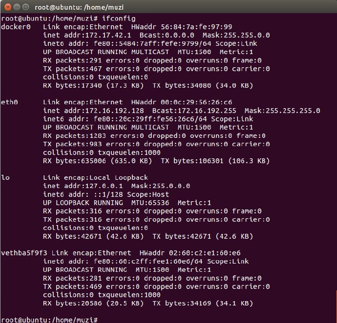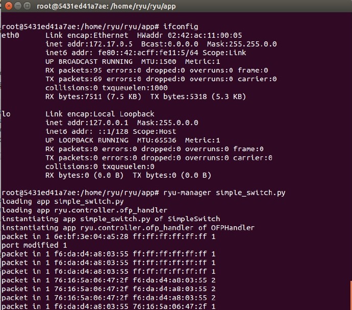 从图上可以看出,与mininet通信的是主机(实际情况下会是某台服务器)eth0的地址。但是从下面的图的容器信息中,可以看出运行的RYU地址是172.17.0.5。为什么可以通信呢?
