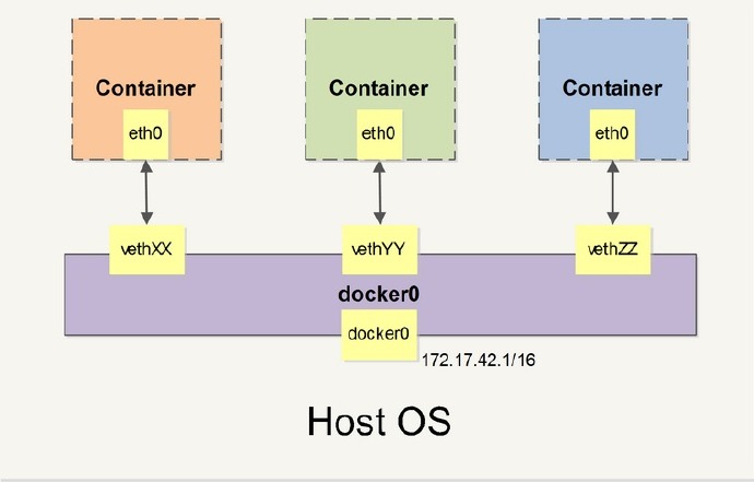 因为做了端口映射,将主机的所有接口的6633端口的地址都转发到容器172.17.0.5的6633端口,从而完成数据通信。其实现的原理是:Docker在启动之后,会创建一个docker0的网桥,从上图可以看到,然后还会创建veth pair。其中一端挂载在网桥上,如上图的vethba5f9f3,另一端是容器的网卡eth0,此案例中是172.17.0.5的网卡。其实这相当与一个link。Docker网络通信原理图如下: